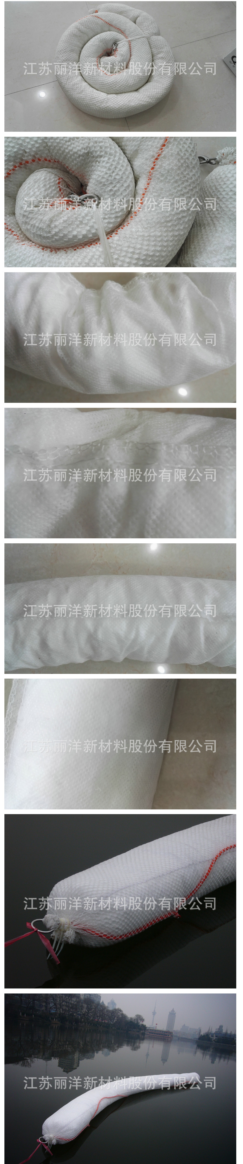 5.由親油性材料制成的吸油柵,內部由超細吸油絮片、纖維混合組成,外有柔性加強網布。通過兩端的活動搭扣,十分方便首尾錯開連接,根據所需長度,依次相連,可覆蓋大面積區域。可以吸附和攔截大面積油污;對于攔截處理水面浮油,防止油污上岸,保護環境效果更佳,可長期數月浮于水面上吸油而不變質、斷裂或下沉。適合內河,湖泊,港口碼頭,排污池水口,污油攔截處理,亦可用于碼頭、沉淀池、污水槽、排水口、或取水口等水體防污、防雜物。可水陸兩用。